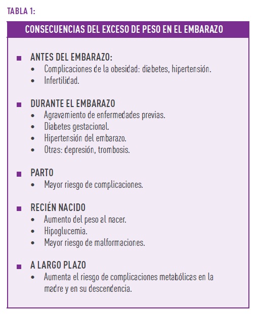 En España, según las últimas estadísticas, la obesidad afecta al 18,7% de los adultos (el 18% de las mujeres). Se han descrito más de 200 complicaciones relacionadas con la obesidad: diabetes, hipertensión, enfermedades articulares, problemas respiratorios, aumento del riesgo de tumores, entre otras. En cuanto a la salud de la mujer, se relaciona estrechamente con el síndrome de ovario poliquístico y aumenta el riesgo de infertilidad y de complicaciones durante el embarazo (1-3). Se estima que la mitad de las mujeres embarazadas en España tienen sobrepeso u obesidad y el 8,3% tiene obesidad grave (IMC > 35 kg/m2). La tabla 1 muestra las complicaciones más importantes de la obesidad durante el embarazo.
