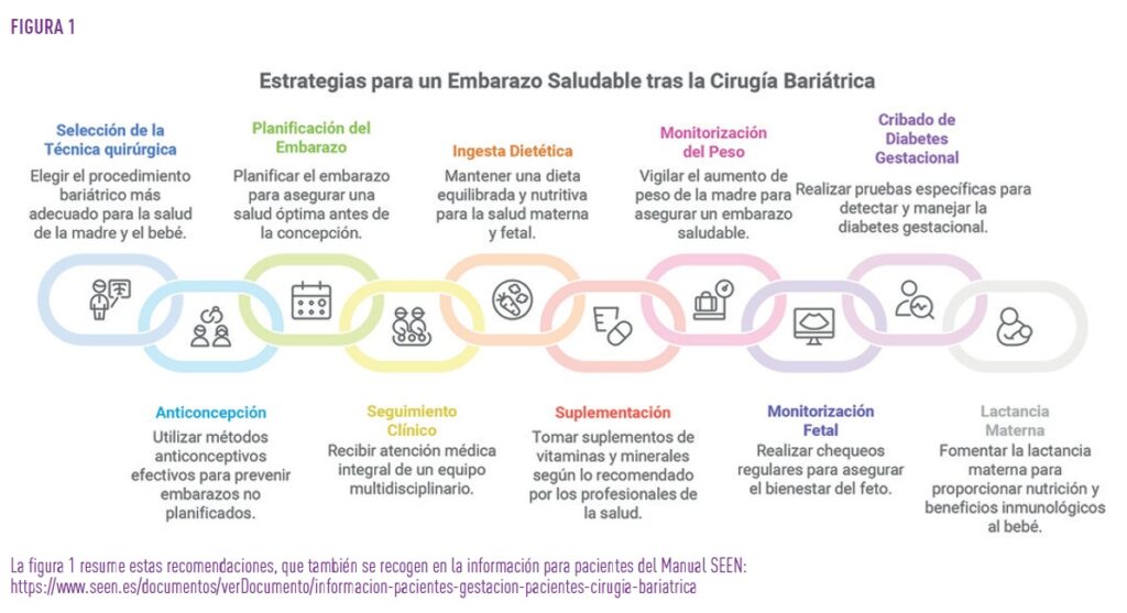 Se aconseja planificar la gestación, con el equipo clínico. Las sociedades científicas recomiendan evitar el embarazo durante los primeros 12 meses tras la cirugía bariátrica (6). Es necesario asegurar una anticoncepción adecuada durante ese periodo. Los anticonceptivos orales pueden tener una menor eficacia, especialmente si existen náuseas y vómitos o por la absorción disminuida que provoca un bypass.