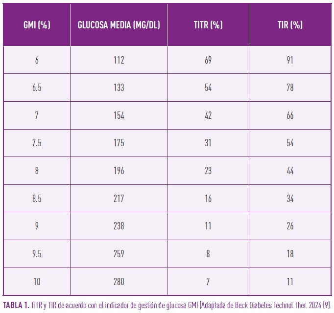 3.-Correlación con otros parámetros. Se ha descrito que existe una correlación no lineal fuertemente positiva entre TIR Y TITR. (4). La relación TIR/TITR está influida por la VG: a mayor VG expresada por CV mayor es el TITR que corresponde a un determinado TIR (4,9). También existe una correlación positiva entre TITR y HbA1c. El TITR en promedio es 20-25% más inferior que el TIR cuando el GMI está entre 6-8% en distintas cohortes y con diferentes tratamientos. La diferencia entre TITR y TIR se estrecha con valores más altos de Hba1c (9). (Tabla 1).