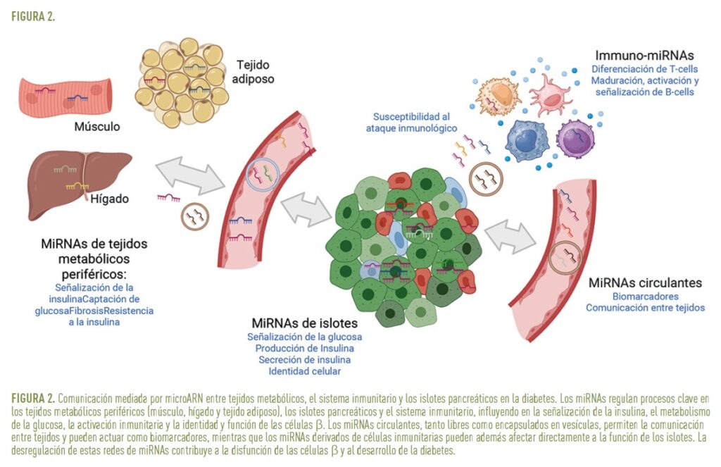 La implicación de los miRNAs en la patogénesis de la DT1 se centra principalmente en torno a dos ejes: la modulación de la susceptibilidad de las células β a la destrucción mediada por el sistema inmunitario, y la contribución de miRNAs derivados de células inmunitarias a la autoinmunidad. La expresión de miRNAs en los islotes está alterada en la DT1 tanto en modelos murinos como en humanos, y en respuesta a condiciones que imitan la DT1, como la exposición a citocinas (10).