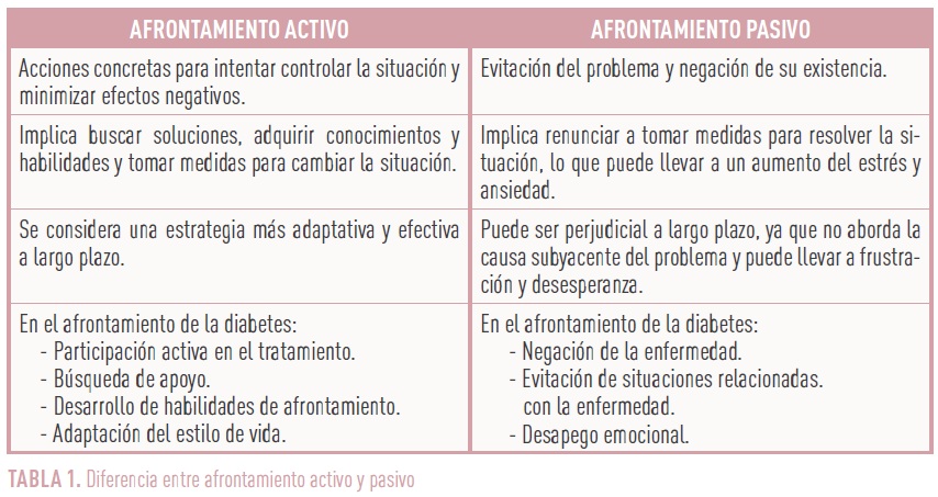 Diversos estudios demuestran que un afrontamiento activo se ha relacionado con una mejor regulación de la glucosa en sangre, mayor adherencia al tratamiento y mayor sensación de autoeficacia. En cambio, se ha observado que llevar a cabo un afrontamiento pasivo impacta negativamente, conduciendo a conductas poco saludables, como el uso del alcohol o la ingesta excesiva de alimentos como mecanismo de evasión, ambas claramente perjudiciales para el curso de la enfermedad.