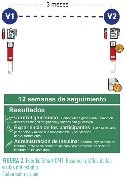 En la primera visita se recogieron datos básicos (edad, sexo, peso, índice de masa corporal, duración de la diabetes y complicaciones) y los participantes comenzaron a usar la pluma conectada para administrar insulina basal y prandial.